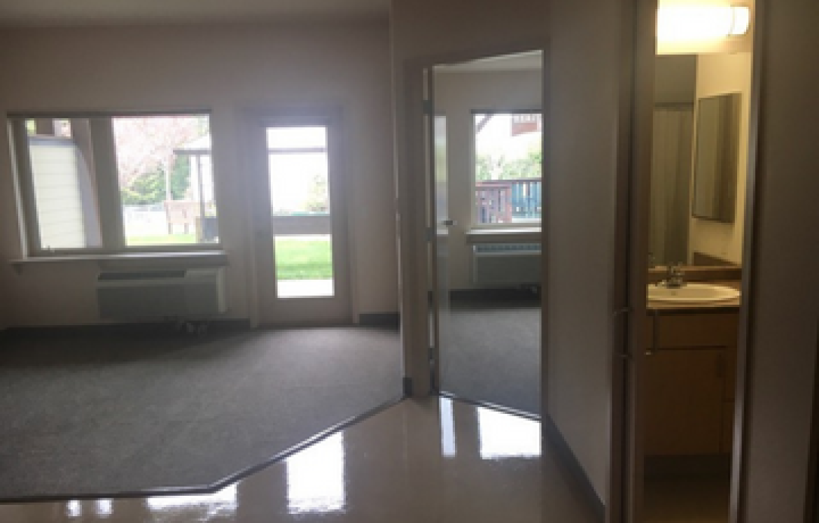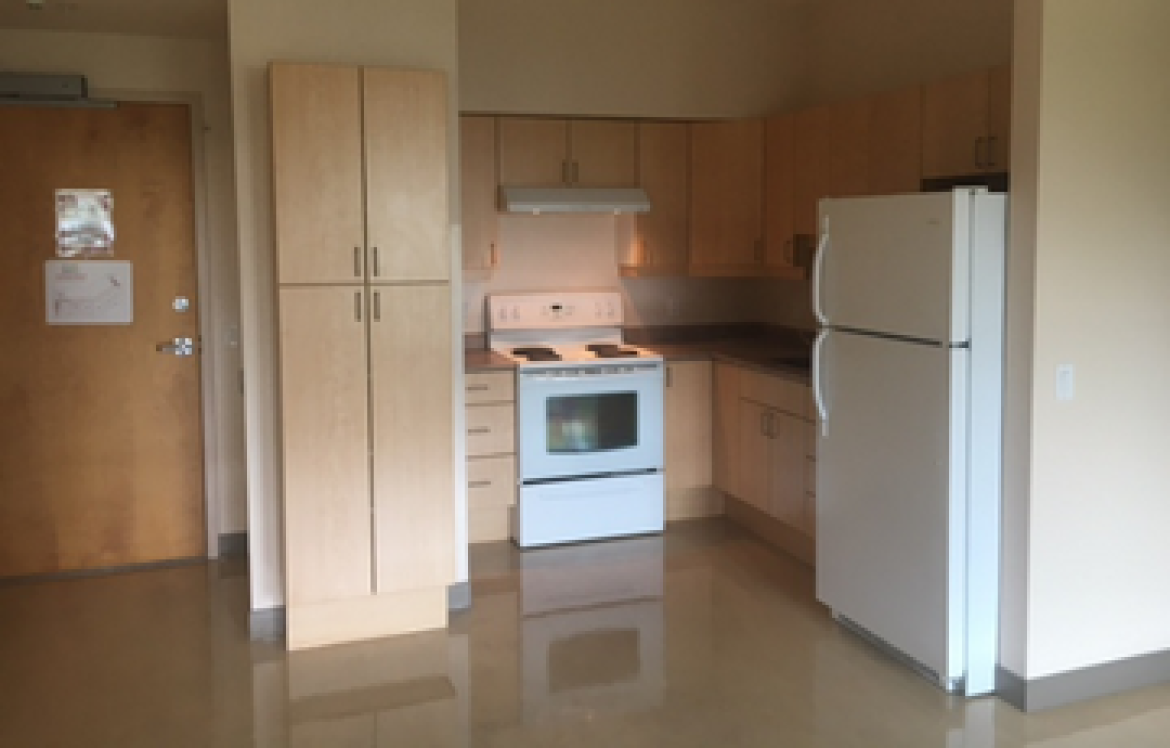 All suites have a full kitchen with a regular size fridge and stove, as well as space for a microwave and a generous storage area. Washrooms in suites are fully accessible and contain walk-in showers, grab bars and built in seating.