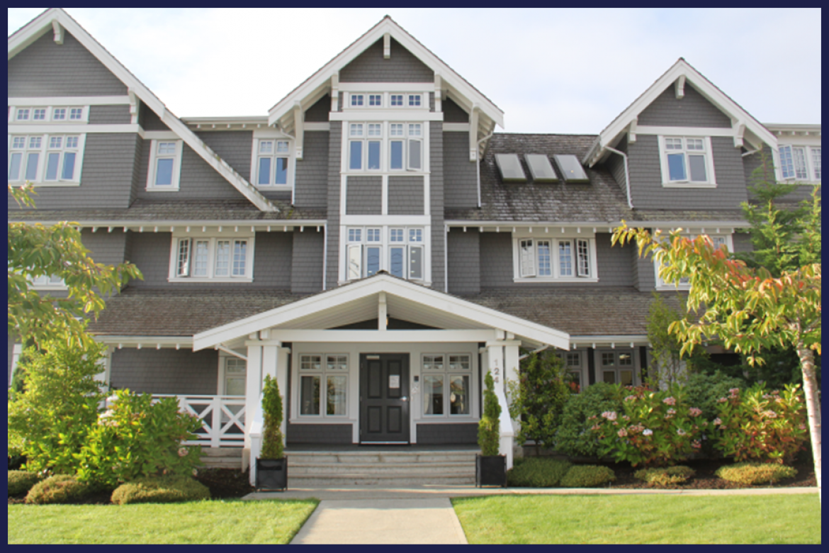 Three-storey Tudor-style building in downtown Qualicum Beach. Qualicum Manor has received a "Building Design Award" by the Town of Qualicum Beach.